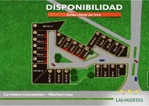 Lotes en venta, fraccionamiento Las Huertas, Ixtacomitán; Villahermosa, Tabasco.